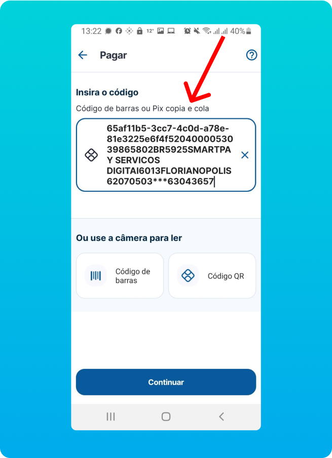Cole o "Código PIX" e clique em "Continuar" para realizar o pagamento.